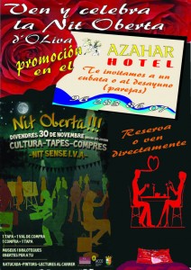 Ven a Oliva y disfruta de “la nit oberta” y luego ven a pasar la noche en el Hotel Azahar y disfruta de nuestra promoción es especial para esta noche 1 copa gratis por pareja o el desayuno para el día siguiente.!! Oliva esta de moda!!